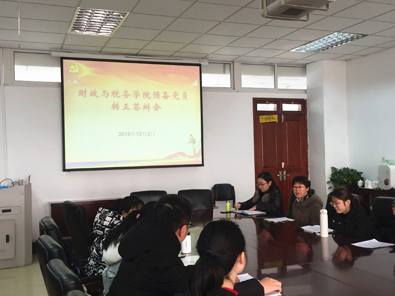 大学生党员发展工作“三投票三公示一答辩”实施办法,提高大学生党员发展质量,加强财政与税务学院学生党建工作,2019年12月2日,财政与税务学院在学院408会议室举行了预备党员转正答辩会。学院党委副书记李慕原以及各学生支部书记参加并担任答辩组评委,会议由学生第一支部书记李玲主持