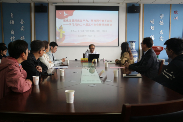 胡连生教授作了题为“聚焦发展新质生产力,坚持两个毫不动摇——关于党的二十届三中全会精神的体会”专题报告。胡教授介绍了什么是新质生产力以及发展新质生产力的深远意义,提出我们要以科技自主创新发展为驱动,打好关键核心技术攻坚战。接着,他讲解了两个毫不动摇的具体内涵,分析了两个毫不动摇再次提出的历史背景,进而阐释了坚持两个毫不动摇对于推动经济持续健康发展和社会的全面进步的重要导向作用。