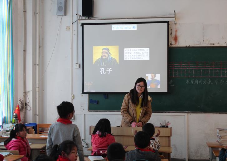 整个诵读活动书声清朗,韵味流长。大学生讲解员们着重围绕传统文化中的“向学”和“孝道”带领小学生共同诵读,配以富有趣味的视频资料讲解,气氛轻松而愉悦。同学们以幽默通俗的语言介绍了孔子的故事,通过故事向小学生们讲解“知之者不如好之者,好之者不如乐之者”这类渗透着儒家文化的古典佳句。他们还通过介绍圣贤舜孝顺父母的故事,展示甲骨文“孝”字等方式,向小学生介绍了孝文化在中国传统文化中的重要地位。