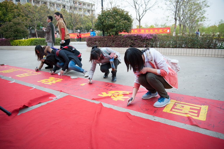学生会的干事们到达外场所在地之一的西苑,紧锣密鼓地进行外场的布置工作。大到搭建帐篷,摆放桌椅、广告牌、签名横幅,小到要发放的宣传手册和税月特别书签,都准备齐全,丝毫不差,而礼宾、玩偶也早早地各就其位。于细枝末节处也能显示出我们对于这次活动的极大重视。十点半,如潮的人流涌来,西苑的外场活动也随之开始。