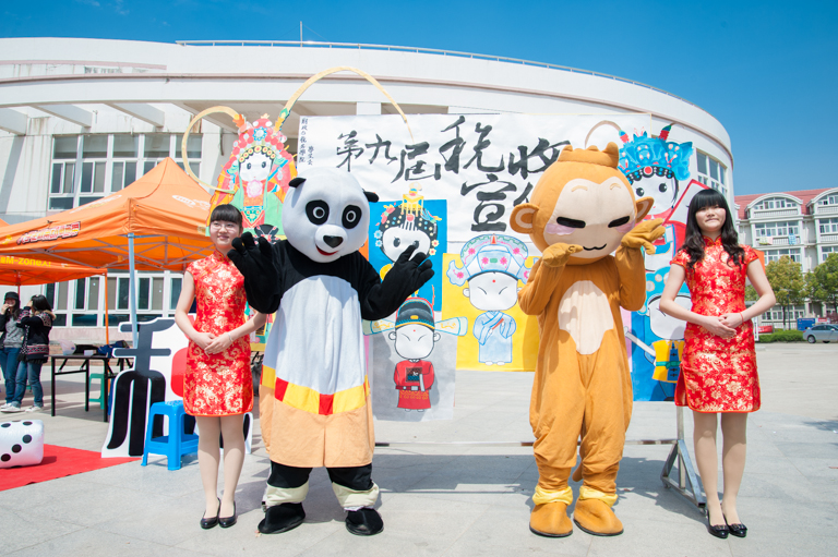 熊猫玩偶与嬉戏猴玩偶站在路口迎接同学,与过往的同学们互动交流。工作人员沿路发放税收宣传手册以及税月书签,礼宾则站在税月的巨型海报前,手持“税”字样的广告牌,引得路过的同学纷纷驻足,争相合影留念。与此同时,许多同学也在“中国梦,税月情”的横幅上签名。横幅上留下的字,寄托着同学们对于税月满满的祝福。写完了祝福,不少同学还来到游戏区,参加知识问答、计时夹乒乓球等游戏互动,在有趣的小游戏里学习税收知识,了解税收宣传月。