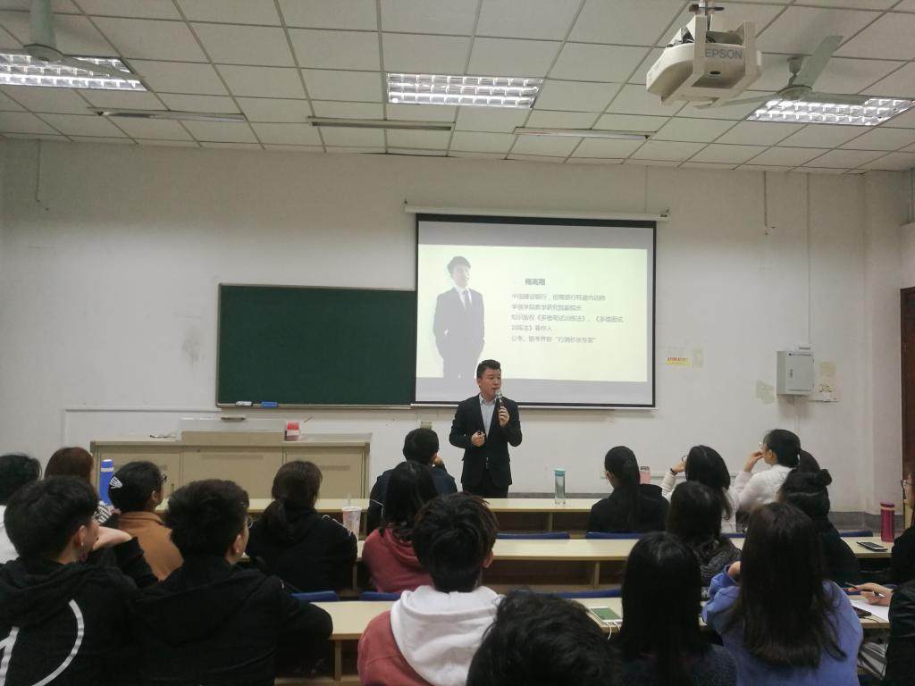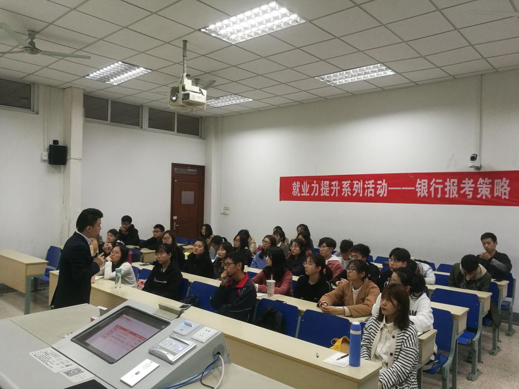 3月27日下午,财税学院就业力提升系列讲座第一讲——银行报考策略讲座在德经楼110教室举行,讲座邀请了在银考界被称为“行测秒杀专家”的梅高翔老师主讲。财税学院党委副书记李慕原、辅导员李玲参加了讲座,来自财税学院、公共管理学院、信息工程学院、应用数学学院的部分有志于银行就业的本科生聆听了讲座。