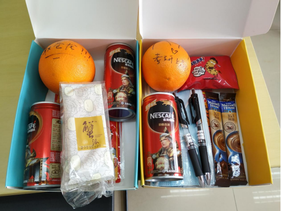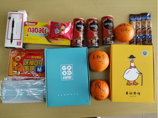 的考研学子们收到了一份“考研橙功鸭”盲盒:暖心橙子,精美文具,助力咖啡,惊喜零食,口罩暖宝······冬日“研”途,丝丝温情洋溢于盲盒之中。