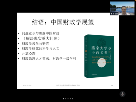 2021年10月28日,应财政与税务学院、公共财政研究中心和中国财税治理研究院的邀请,中国社会科学院财经战略研究院副院长、博士生导师杨志勇教授通过腾讯会议为学院师生做了题为《财税国家项目选题要点:中国财政学史研究刍议》的线上学术讲座。讲座由财政与税务学院院长、公共财政研究中心主任朱军教授主持,学院中青年教师、全体硕士研究生和部分本科生参加了本次讲座。