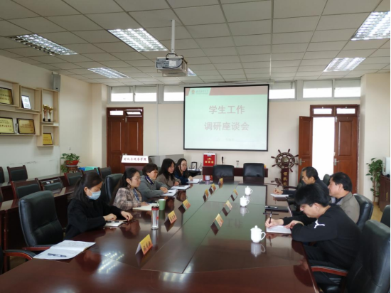 ,与学院学工队伍工作人员交流。座谈会在仙林校区德经楼408会议室举行。