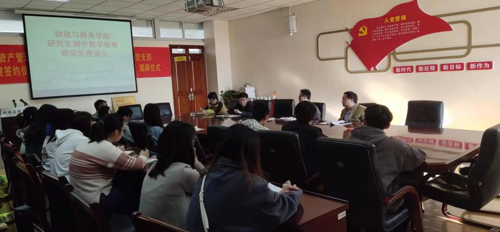 在德经楼408会议室召开了研究生期中教学检查学生座谈会。校研究生教学督导组成员张士杰教授、税务系主任汪卢俊副教授和部分教师代表、院研究生秘书殷立荣老师以及各年级研究生代表参加了会议。座谈会由院长助理骆永民教授主持。