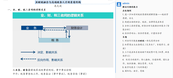 加强理论与实践相结合,培养高端税务人才。税务专业硕士人才的培养,不仅要夯实专业理论基础,更要培养实践工作能力。高允斌老师在讲座中以“业财税融合与高端税务人才的素质结构”主题,引导同学们深入思考“如何在学习法规的同时将知识运用到业务中?”“税务人才应该如何学习?需要具备哪些素质?如何才能迈向更高的层级?”等问题。吴健老师分享的“从首次综合所得汇算清缴看个人所得税制改革与完善”专题,从理论角度全面阐述个人所得税法的修订历程,系统的分解个税法的若干法条,课程包含大量实务中的税收案例,实现理论与实践教学的有机结合。