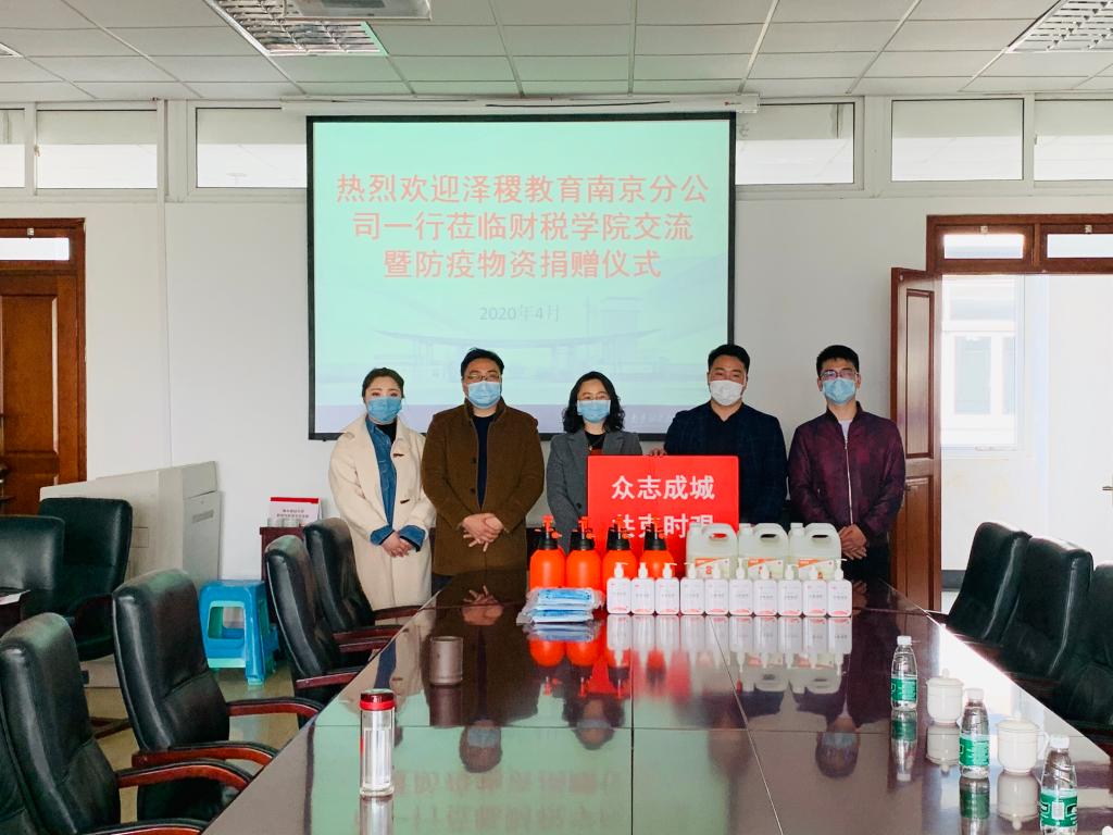 4月10日下午,泽稷教育南京市场部总监、总裁助理宁兆丰一行4人到成人动漫 捐赠了高浓度消毒液、洗手凝胶、一次性口罩等防疫物资。院党委书记陈苏、院长朱军、党委副书记李慕原出席捐赠仪式。