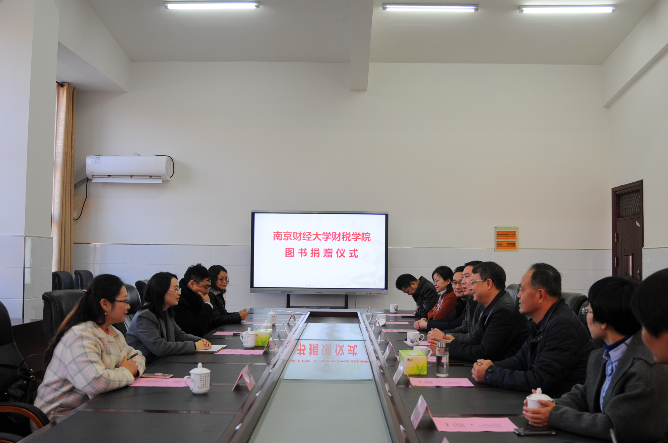 与句容市天王中学扶贫共建暨图书捐赠仪式在天王中学会议室举行。句容市副市长冯琳,天王镇镇长袁民,副镇长赵九红,句容教育局副局长徐燕,天王中学副校长陈远明,财税学院党委书记陈苏,副院长(主持工作)朱军,党委副书记李慕原,教工党员代表李婧等出席了该签约仪式。
