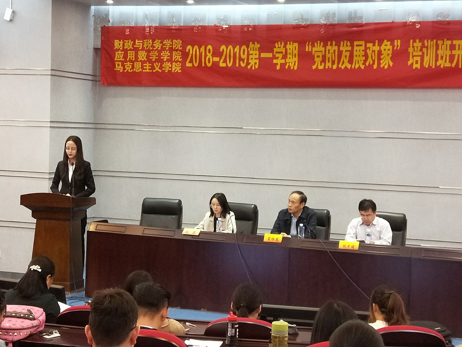 与应用数学学院、马克思主义学院联合开展的第十一期党校在行政楼2楼报告厅举行了开班仪式暨专题报告会。出席本次开班仪式的有财税院党委书记陈苏、应用数学学院党总支书记常根发、马克思主义学院党总支书记耿步健,全体党校学员参加了开班仪式。开班仪式由成人动漫