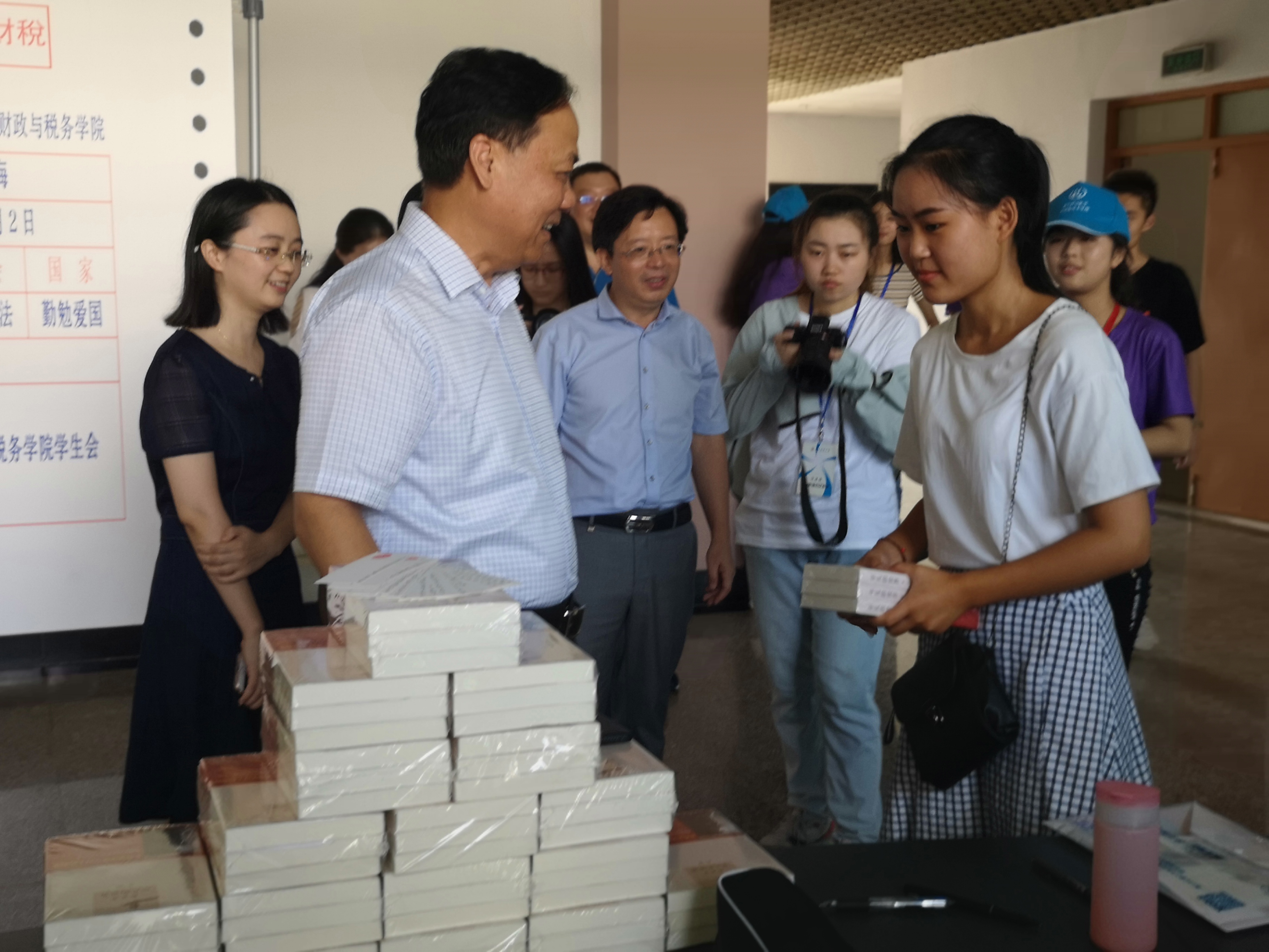 党委书记陈章龙为学生代表赠书,并鼓励学子美好的生活要靠自己去争取与奋斗。
