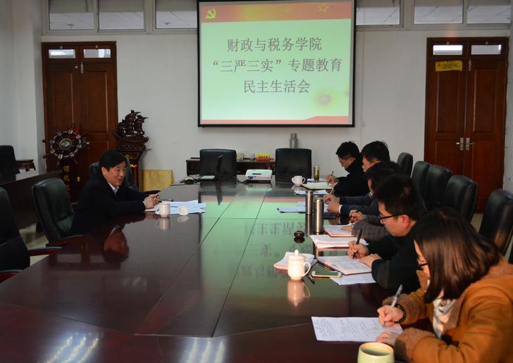 “三严三实”专题民主生活会在经济学科楼408会议室召开。学院联系点校领导黄建元总会计师出席专题民主生活会,学院党政领导班子全体成员参加会议。会议由学院党委书记张金龙主持。
