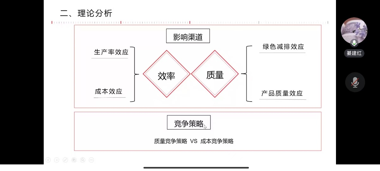 在本次学术讲座中, 綦建红教授从贸易高质量发展的角度引出多产品企业,进而从质量竞争策略和成本竞争策略的来探讨人工智能对出口产品范围的影响。