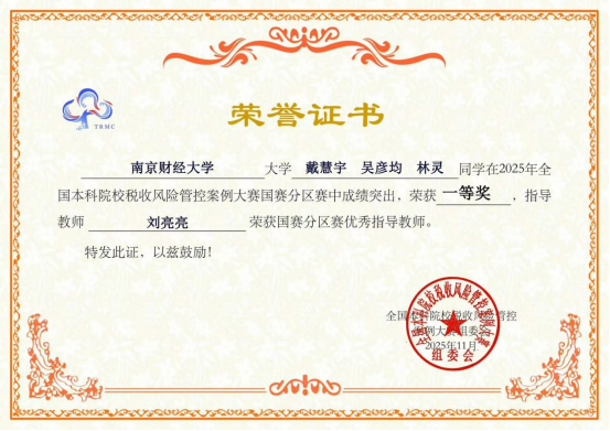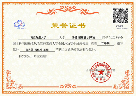近日,全国本科院校税收风险管控案例大赛总决赛在浙江财经大学举行。我院财政2301班冯涵、税收2303班张丽媛和刘靖瑜组成的“财情税意”队在税务系张秀莲副教授、张琳玲副教授、党委副书记王翔指导下以省赛一等奖的成绩入围总决赛,并最终获全国二等奖,张秀莲、张琳玲、王翔老师获评全国总决赛优秀指导教师。